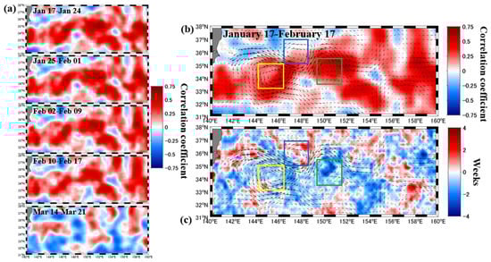 Maps of correlation coefficients between winter sea surface height anomalies (SSHAs) and onsets of the spring bloom. In (a) from top to bottom, analyses were conducted using mean SSHAs observed during 17–24 January, 25 January–1 February, 2–9 February, 10–17 February, and 14–21 March. Panel (b) is the same as (a), except that the SSHAs were averaged from 17 January to 17 February. Panel (c) is the mean spring bloom onset difference (Δonset) between the periods of unstable and stable Kuroshio Extensions (KEs) calculated by subtracting mean spring bloom onset during years of stable KEs from the mean spring bloom onset during years of unstable KEs. Vectors overplotted on (b,c) are winter (January–March) ocean surface current differences between the periods of unstable and stable Kuroshio Extensions (KEs) based on Ocean Surface Current Analysis Real-Time data. The yellow, green, and blue boxes shown in panels (b,c) represent the areas from which the data were extracted to be shown in Figure 5.