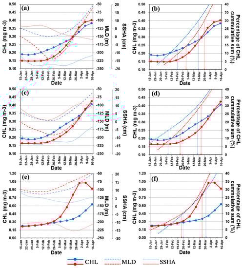 (a) Winter–spring mean temporal variations of chlorophyll-a concentrations (CHL) (solid lines with data symbols), mixed layer depth (MLD) (dashed lines), and sea surface height anomalies (SSHA) (dotted lines) averaged over the region indicated by the yellow box in Figure 4b,c. The blue and red lines indicate the data during the unstable and stable periods of the Kuroshio Extension (KE), respectively (see Figure 2e for the years of unstable and stable KEs). (b) CHL data as in (a) overplotted with their cumulative sum in percentage (dashed lines). Panels (c,d) and (e,f) are the same as panels (a,b) except that they were derived from the regions indicated by green and blue boxes, respectively, shown in Figure 4b,c. The blue (red) downward arrows in (b,d,f) indicate the onsets of the spring bloom defined, respectively, by 15 and 30% thresholds during the periods of unstable (stable) KEs.