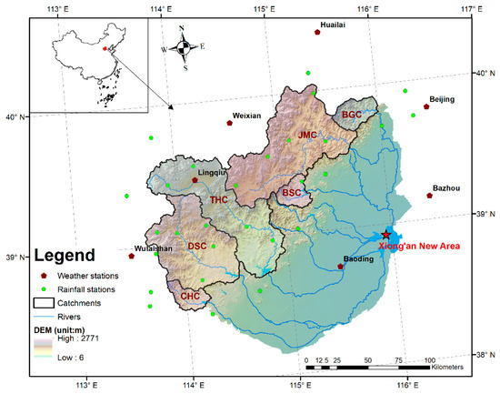 The water-source region of the Xiong’an New Area is located between 38°3′~40°4′ N and 113°39′~116°12′ E in the semi-arid region in North China, and covers an area of 3.12 × 104 km2 with the mountainous areas in the northwest and plain area in the southeast (Figure 1). Because the mountainous areas contribute to more than 75% of the water-yield generation for the Xiong’an New Area, the major six catchments of the water-source region were selected as the study area, including the Baigouhe Catchment (BGC), Jumahe Catchment (JMC), Baishahe Catchment (BSC), Tanghe Catchment (THC), Dashahe Catchment (DSC) and Cihe Catchment (CHC), ordered from the northeast to southwest. Details of the six catchments are shown in Table 1. The region has a semi-arid continental monsoon climate, with a mean annual temperature of 8.4 °C and it increases gradually from southwest to northeast across the mountains. The annual precipitation is about 576 mm and is mainly concentrated in the summer season. The major land-cover types in the region are forest (42.8%), grassland (39.9%), cropland (12.0%) and the rest of the land types, including water area and urban land, are relatively small, only accounting for about 5.3%. The dominant land-use type in the northeastern part is forest (83%) in the BGC and the area of forest decreases gradually to 22% in the THC and then increases again to 47% in the southwestern part (CHC), while the grassland and cropland increases firstly and then decreases from northeast to southwest. The forest is a mix of temperate coniferous and broad-leaved, mainly composing of oak, hornbeam, Chinese pie, larch and poplar. The grassland consists of white grass, yellow back grass and artemisia, etc. The crops include grains, beans, tubers and oil crops, etc.