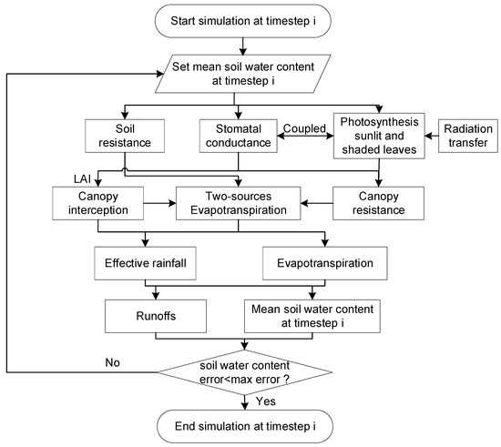 The major calculation procedure to iteratively solve of the ecohydrological processes are shown in Figure 2. Firstly, the initial mean soil water content was set to calculate the soil resistance. The stomatal conductance, photosynthesis and the canopy resistance were calculated, and were affected by soil moisture. Then, the ET with its three components and runoff could be estimated. After that, ET, effective rainfall and runoff were input to Equation (1) to solve the mean soil water content by comparing it with the initial mean soil water content until it converges using the Newton iteration. With these calculation steps, the mean soil moisture was iteratively calculated, and then the ET, GPP and other fluxes were estimated.