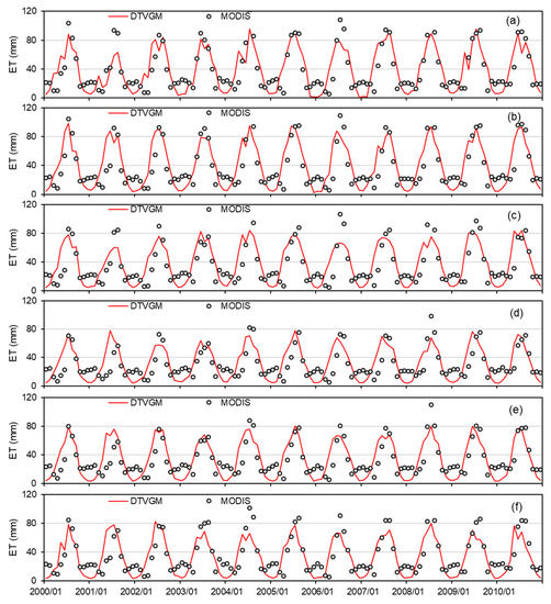 Comparison of seasonal dynamics between DTVGM simulated and MODIS ET in the six catchments BGC (a), JMC (b), BSC (c), THC (d), DSC (e), CHC (f).