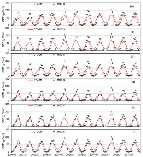 Comparison of seasonal dynamics between DTVGM simulated and MODIS GPP in the six catchments BGC (a), JMC (b), BSC (c), THC (d), DSC (e), CHC (f).