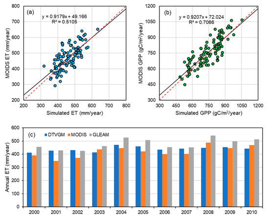 Comparison of the MODIS and simulated annual ET (a) and GPP (b) by DTVGM and the simulated annual ET by DTVGM with MODIS and GLEAM (c). The dashed line indicates the 1:1 line and the black line is the least-squares linear fit to the data.