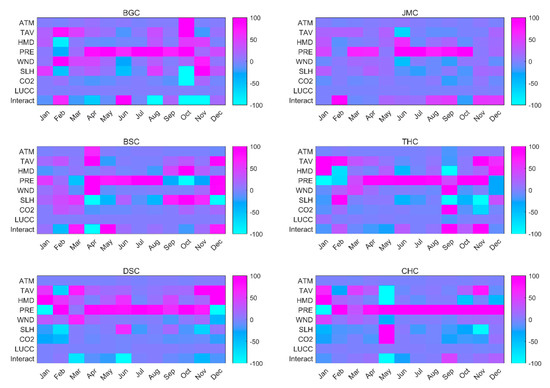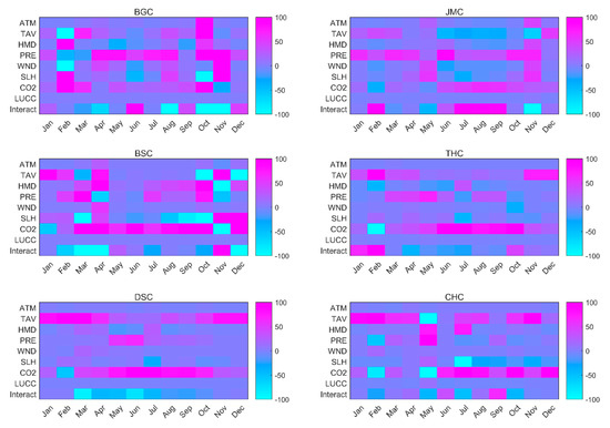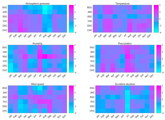 The monthly Mann–Kendall changing trends of the climate variables in the six catchments are shown in Figure 6. The color bar indicates the changing trends in the variables. The atmospheric pressure displayed a significant decrease in summer and autumn, particularly in August and September. The humidity shows a dropping trend, particularly in January. The monthly precipitation increased mostly in February, April, July, August and October, particularly in the wet season, while it decreased in the dry season, especially in January, November and December. For the sunshine duration, it decreased almost throughout the year, especially for July. The windspeed decreased in most of the months, particularly during March, April, October and November. Unlike the changes of windspeed, the monthly temperature increased gradually in most of the months, and fell mostly in February and July.