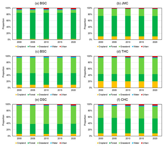 Land-use and cover change (LUCC) is recognized as important factors that influence evapotranspiration and vegetation carbon assimilation. Therefore, the land use changes were also investigated in the six catchments as shown in Figure 7. In the six catchments, the dominant land coverage is forest, grassland and cropland, covering almost nearly 95% of the whole basin. In the BGC, the major land cover is forest (83%) and grassland (9%). The forest decreases to 64% in the JMC and the rest are mainly grassland (22%), cropland (10%). While in the BSC, the main land cover is grassland (49%), the forest decreases to 36%, cropland is about 10%, respectively. In the THC, the grassland increases to 51% and the cropland increases to 21%, while the forest decreases to 22%. In the DSC, the chief land cover is still grassland (57%), while the cropland decreases to 7% and the forest increase to 32%. In the CHC, the main land covers are forest (48%), grassland (38%) and the cropland constitutes about 8%.