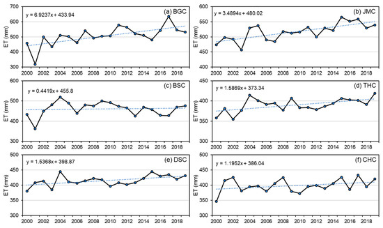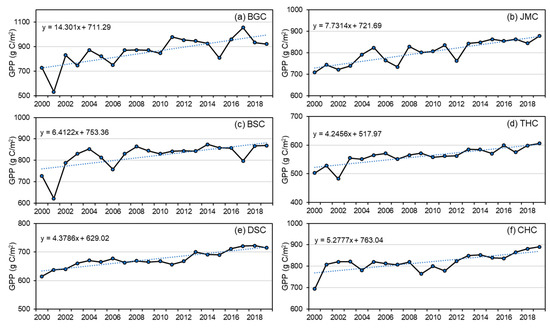 The changes in ET and GPP were examined from 2000 to 2019 based on the DTVGM simulation using historical observations in the six catchments (Table 6). The ET and GPP in the region show a significant increase (α = 0.01) of 2.40 mm/a and 6.00 gC/m2/a, respectively. Figure 8 shows simulated annual ET in the six catchments during the past years. The ET increased at the rate of 6.92 mm/a, 3.49 mm/a, 0.44 mm/a, 1.59 mm/a, 1.54 mm/a and 1.20 mm/a for GBC, JMC, BSC, THC, DSC and CHC, respectively. The Mann–Kendall test reveals that the ET increased significantly in the BGC, JMC, DSC (α = 0.01) and THC (α = 0.05), while it is not obvious for the BSC and CHC. Figure 9 displays the modeled annual GPP in the six catchments. The GPP shows significant increasing trends in all of the six catchments at a significance level of 0.01. Additionally, the changing trends are 14.30 gC/m2/a, 7.73 gC/m2/a, 6.41 gC/m2/a, 4.25 gC/m2/a, 4.38 gC/m2/a, 5.28 gC/m2/a for GBC, JMC, BSC, THC, DSC and CHC, respectively.