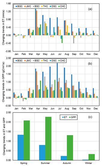 Furthermore, the variations in ET within the year were investigated as shown in Figure 10a. In the BGC, the ET increases in all the months, especially in the spring and summer season from April to September. However, the ET shows decreasing trends in some months in the autumn and winter seasons and increased mostly in spring and summer seasons in the other five catchments. Particularly, the ET decreased from autumn to early spring in the following year in the BSC. Figure 10b displays the changing pattern in GPP within the year. The GPP increased in nearly all the months except for February. The major increase in monthly GPP mainly occurred in the spring and summer seasons, from April to September. Figure 10c summarizes the mean changes in ET and GPP in the water source region, and both ET and GPP increased mainly in spring and summer, while the uptrends were relatively smaller in autumn and winter.