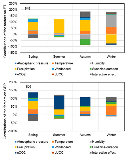 On the seasonal scale, the increases in ET and GPP mainly occur in spring and summer and the increases are relatively small particularly in winter. Similar results are also found in the northeastern part of China [55]. The major reason for the increase in ET and GPP in spring and summer is obvious rising temperature and increasing precipitation in the two seasons, which may be due to the availability of more accumulated temperature and water during the growing season. In autumn, significant solar dimming should lead to lower ET and GPP uptrends, while the humidity decreases significantly and lower increases in precipitation and temperature cause little ET and GPP increase in winter. Besides, the interactive effects of the climate variables, eCO2 and LUCC are significant in spring and winter, and have positive effects on the ET (16.2%) and GPP (27.8%) uptrend in spring and negative effects on the ET (−24.4%) and GPP (−38.0%) uptrend in winter. Meanwhile, the interactive effects are also significant in autumn in ET increase (42.9%). This finding is consistent with the conclusion that interactive effects are important in water-limited catchments, whereby the ecosystem structure and function are mainly constrained by water [39,56]. Additionally, this may be related to the strategy mechanism of the ecosystem in adapting to changing circumstances.