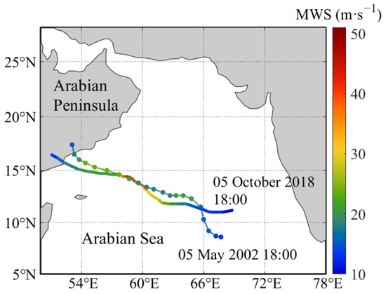 The tracks of TCs ARB 01 and Luban were obtained from the Joint Typhoon Warning Center (JTWC; https://www.metoc.navy.mil/jtwc/jtwc.html accessed on 20 October 2021), which provided typhoon forecasts for the Western Pacific and Indian Ocean basins. Data of TC was at 6-hour intervals, including time, wind speed, and central location. The moving speed of a TC can be calculated according to the moving distance of the TC center every 6 h. The tracks of the two TCs are shown in Figure 1. As shown there, the path of 2002 ARB 01 is similar to that of 2018 Cyclone Luban, where 2002 ARB 01 was generated at 18:00 on 5 May 2002, landed at 12:00 on 10 May 2002, and dissipated at 18:00 on 10 May 2002. TC Luban was generated at 18:00 on 5 October 2018, landed at 06:00 on 14 October 2018, and dissipated at 18:00 on 14 October 2018. Both TCs had similar central pressures at landfall, but TC Luban’s maximum wind speed was slightly stronger than that of ARB 01.