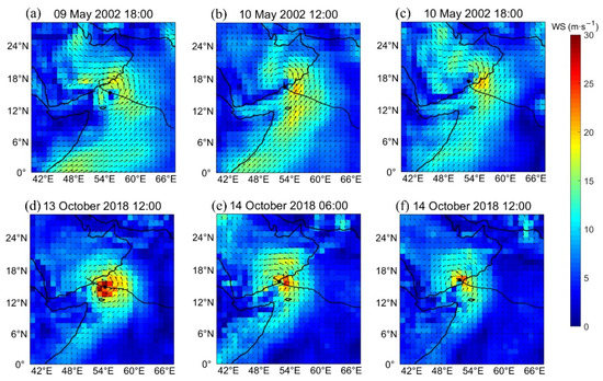 Wind speed (m/s) distribution of ARB 01 on (a) 9 May 2002 18:00, (b) 10 May 2002 12:00, and (c) 10 May 2002 18:00, and Luban on (d) 13 October 2018 12:00, (e) 14 October 2018 06:00, and (f) 14 October 2018 12:00. Black dots indicate the TC center.