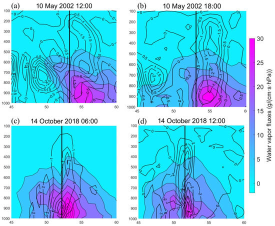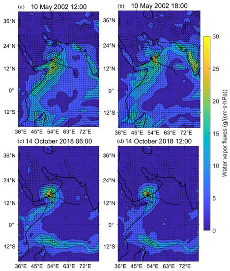 Water vapor fluxes distribution of ARB 01 on (a) 10 May 2002 12:00, and (b) 10 May 2002 18:00 at level = 850 hPa and Luban on (c) 14 October 2018 06:00, and (d) 14 October 2018 12:00 at level = 850 hPa. Black dots indicate the TC center.