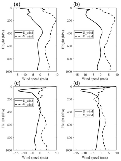 Variation in 200–800 km mean meridional (U_wind)(m/s) and zonal (V_wind)(m/s) winds at (a) 10:12, May 2002, (b) 10:18, May 2002, (c) 14:06, October 2018, and (d) 14:12, October 2018.