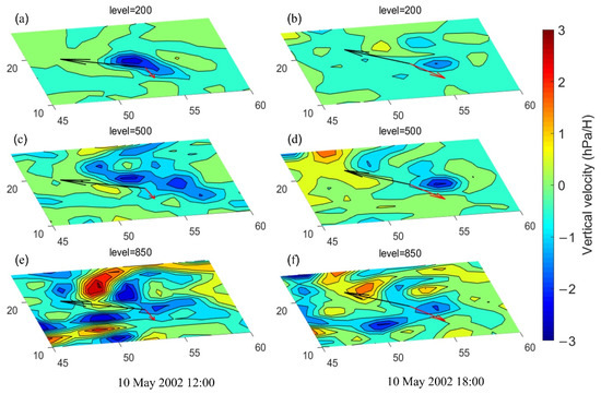 The vertical velocity (hPa/H) distribution of ARB 01 during (a,c,e) and after landfall (b,d,f) at level = 850 hPa, level = 500 hPa, and level = 200 hPa. The black arrow represents the deep-level environment VWS, and the red arrow represents the low-level environment VWS.