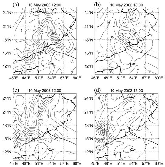 The divergence (10−5 s−1) of ARB 01 during and after landfall. (a) 10 May 2002 12:00, (b) 10 May 2002 18:00 at level = 200 hPa; (c) 10 May 2002 12:00, (d) 10 May 2002 18:00 at level = 850 hPa. The black dot indicates the TC center.