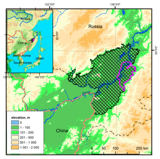 - Ostroukhov, A.V.; Klimina, E.M. Survey of Middle Amur lowland terrain transformations based on remote sensing data. In Proceedings of the Joint Symposium on Tropical Peatland Restoration 2018. Responsible Management of Tropical Peatland following up to The Jakarta Declaration, Jakarta, Indonesia, 22 February 2018; IKAPI: Bogor, Indonesia, 2018; pp. 123–129. [Google Scholar]