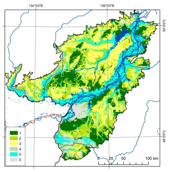 Types of ecosystems in the Middle Amur Lowland (MAL) territory. Types of ecosystems: 1, forest; 2, forest–meadow–mire; 3, meadow–mire; 4, floodplain, mainly forest; 5, floodplain, mainly meadow–shrub; 0, developed lands (residential and industrial, reclaimed, and agricultural) [40,47].
