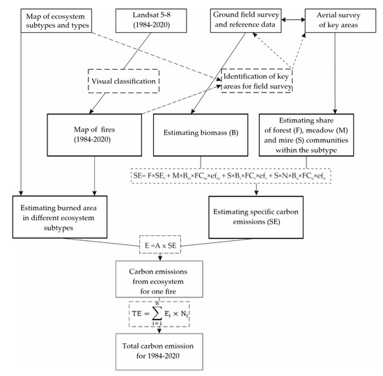 During 2018–2019, field studies were carried out within the key LA site. In the course of the work, data were collected on reserves of dry combustible matter in the meadow and mire ecosystems typical of the MAL territory. In total, 60 plots were laid within 20 key areas located in various subtypes of ecosystems that were affected by fires over the last 3 years (the fire age was specified according to remote sensing data). The combustible materials (grasses, sedges, shrubs, and mosses) were sampled, and a geobotanical description and aerial photography were carried out at each plot using the methods described above (Section 2.2. Estimating Carbon Emissions). After analyzing field data and published materials, based on the adapted model of Seiler and Crutzen [9]), we were able to calculate both the carbon emissions specifically emitted during fires across various types of ecosystems (2, 3) and the total emissions (4) for 1984–2020 (Table 4, Figure 7).