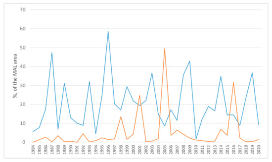 Processing long-term series of Earth remote sensing data for the Middle Amur Lowland (MAL) site allowed us to identify areas burned by fires in spring and autumn during 1984–2020 (Table 2, Figure 5). Over this period, the smallest pyrogenic impacts were observed in 1984, 1994, and 2010, when fires burned 5.7%, 5.3%, and 2.8% of the MAL territory, respectively; in the most unfavorable years (1996 and 2005), fire-burned areas exceeded 50% of the total land area. Considering the whole time period, an average of 25.4% of the total land area was impacted by fires.