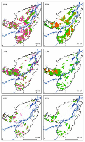 Burned areas within the Middle Amur Lowland (MAL) territory during 2014, 2018, and 2020 according to various data sources: VIIRS (A,C,E), GABAM (B,D,F) [59], and the authors’ data (green).