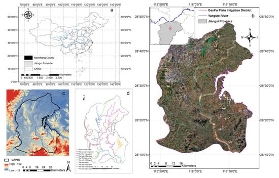 Overview of study area. (a) Geographical location of Jiangxi Province; (b) Location of the study area; (c) DEM of the study area; and (d) Distribution of the water conservancy project in the GFPIS.
