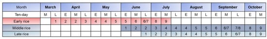 The GFPIS (8°10′–28°48′ N, 115°48′–116°17′ E) is the largest diversion irrigated area south of the Yangtze River in China (Figure 1) and one of the main grain-producing areas in Jiangxi Province, with an effective irrigated area of approximately 67,000 Hm2. The main crop planted in this region is rice, which can be divided into double-season early and late rice and single-season middle rice. The growing season is shown in Figure 2 [44]. Among the rice crops, double-season early-late rice may only be planted with early-late rice, which is rotated with cash crops, such as vegetables, melons, and fruits.