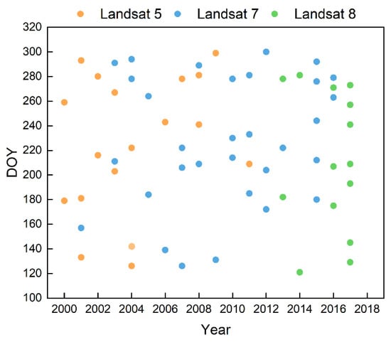 The Landsat images have the same spatial resolution and continuous temporal coverage. All of the Landsat images are level 1 T data, with terrain corrections referencing the World Reference System-2 and intercalibrated across the various Landsat sensors; thus, these images are suitable for time series processing analysis. According to the rice growing season in the GFPIS, satellite imagery acquisition occurred between 20 April and 31 October from 2000 to 2017. All cloud-free Landsat 5 TM, 7 ETM+, and 8 OLI images (Path 121 and Row 40) from the U.S. Geological Survey (USGS) Earth Explorer data portal (http://earthexplorer.usgs.gov/, accessed on 10 January 2022) were downloaded. A total of 63 images were used, and Figure 3 shows the temporal distribution of the available Landsat images.
