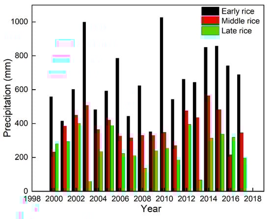 First, the total precipitation during the growing seasons of early, middle, and late rice from 2000 to 2017 was statistically analyzed, and the results are shown in Figure 4. Overall, the total precipitation during the growing season of early rice was the highest and ranged from 351.8 mm to 1025.9 mm, with the minimum value occurring in 2009 and the maximum value in 2010. The second highest was the total precipitation during the growing season of middle rice, with a minimum value of 216.2 mm (2016) and a maximum value of 563.8 mm (2014). The total precipitation of late rice was the lowest and ranged from 58.9 mm to 401.2 mm. These results indicate that precipitation is abundant in the early rice growing season and less abundant in the late rice growing season, and the total precipitation in the middle rice growing season is between that of early rice and late rice.