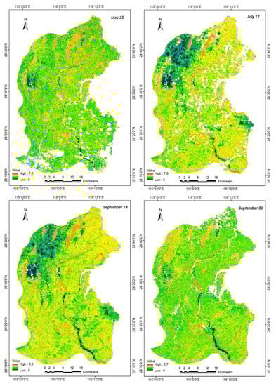 In this paper, Landsat images on typical days with cloudless skies or less cloud cover were selected to analyze the estimated surface ET results in the growing season of 2017, which were 25 May, 12 July, 14 September, and 30 September 2017. Due to cloud cover and other influences, the processing results of some pixels were still null, as shown in Figure 5.