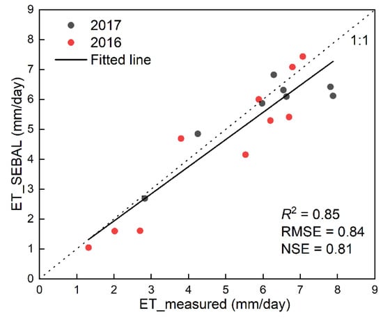 The ET was estimated by the SEBAL model in 2016 and 2017 and the ETs observed based on the eddy covariance at the experimental station are shown in Figure 6. The RMSE of the comparison between the model estimation results and the observation results was 0.84 mm/d, the R2 was 0.85, and the NSE was 0.81. Figure 6 shows that the estimated ET results in 2016 and 2017 were consistent with the observed eddy covariance values. In general, the ET estimated by the SEBAL model was of high accuracy, and the adaptability and stability of the SEBAL model in the irrigated area of GFPIS were satisfactory.