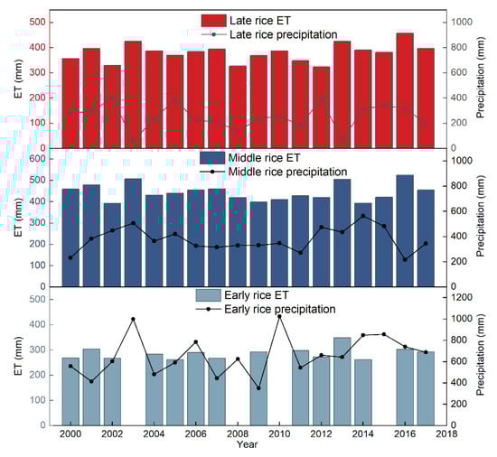 The interannual variation trend of ET during the rice growing season of early rice was not obvious, but the variation trend of ET of middle rice and late rice was consistent. The interannual change in ET of middle rice and late rice was not significant before 2003, and ET of middle rice and late rice showed a downward trend from 2003 to 2009, while ET of middle rice and late rice showed an upward trend from 2009 to 2017.