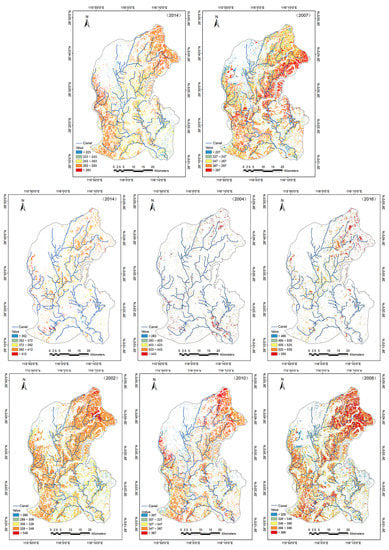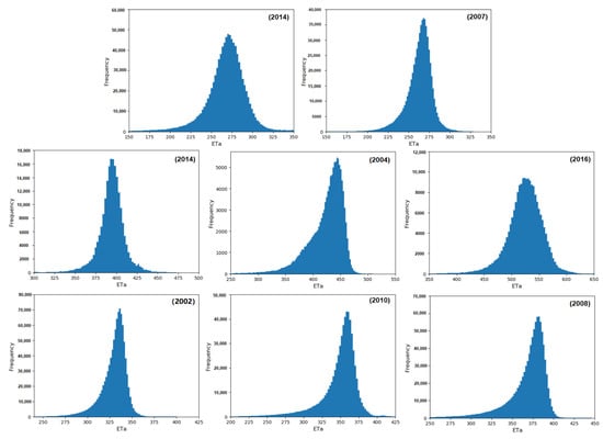 Due to cloudy and rainy weather during the growing season of early rice, limited remote sensing image data are available, and no data are available to calculate the ET of the growing season of early rice in 2003, 2008, 2010, and 2015. Due to the lack of data, we cannot obtain the distribution map of early, middle, and late rice in each year. According to our extraction results for paddy rice in the GFPIS in a previous study [37], the rice planting structure changed, with 2010 as the boundary; according to the available quantity and image quality of satellite data sources during the rice growing period, the middle and double-season rice maps of 2003 were used to calculate the ET of paddy fields from 2000 to 2009 and the middle and double-season rice maps of 2017 were used to calculate the ET of paddy rice from 2010 to 2017. The division of the rice growing season was determined by the observation data from the Jiangxi Irrigation Experiment Station, where the early rice growing season was from 22 April to 10 July, the middle rice growing season was from 26 June to 7 October, and the late rice growing season was from 19 July to 24 October.