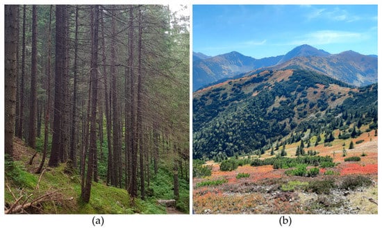 Tatra National Park forest and non-forest communities; (a) spruce forest, (b) a subalpine mosaic. Photos: (a) B. Zagajewski, (b) M. Kluczek.