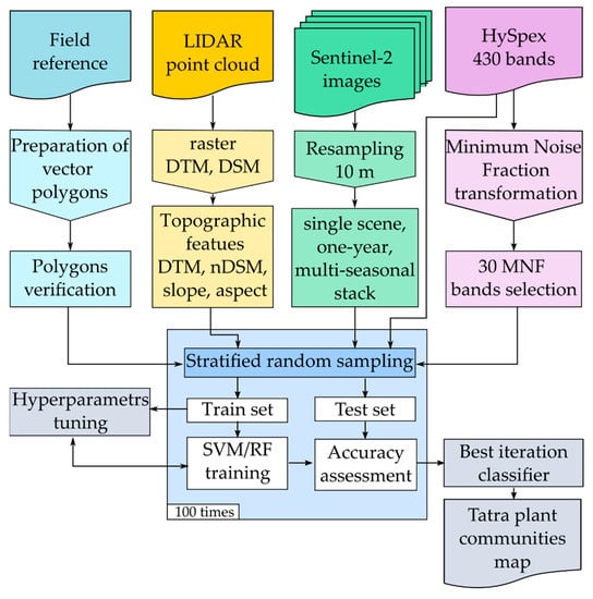 Multitemporal satellite images, hyperspectral airborne data, as well as LIDAR data derivatives (digital terrain model, normalized digital surface model, and slope and aspect maps) were used to make the model more informative and support the process of identifying communities growing in different belts. The R language Random Forest and Support Vector Machines with radial kernel (RBF) were implemented as machine learning algorithms due to the high-quality results achieved [11,53]. The basis for the selection of training and verification polygons was the official vegetation map of the Polish Tatra National Park, based on which a field campaign was conducted by the authors to identify large and homogenous polygons. The patterns are located in all belts in the whole Polish research area. An iterative classification method was used to limit the randomness of choosing training and verification patterns. All classifications were carried out 100 times, selecting the randomized patterns each time. The final stage was the selection of the set offering the highest accuracy (Figure 3).