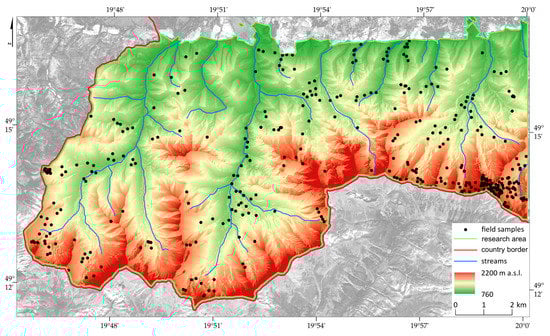 The Tatra Transboundary Biosphere Reserve, one of the most floristically valuable alpine areas, covers areas of the Polish Tatrzański Park Narodowy (TPN) and the Slovak Tatranský Národný Park (TANAP). The area is a subject of numerous vegetation studies [54], based on a fixed network of surveying polygons [55] on which phytosociological mapping is undertaken using the Braun–Blanquet method [56]. The study area was the western part of Tatra Mountains (Western Tatras) located in the Polish Tatra National Park, extending over an area approximately 17 km in length and 7–10 km in width, covering approximately 115 km2 (Figure 1). Tatra Mountains are one of the most valuable areas in Europe, listed in the UNESCO Man and Biosphere Reserve (1992) and Natura 2000, characterized by alpine conditions, high biodiversity, and endemic species. Climate conditions are characterized by mean yearly temperature variations from +6 °C in the lowest parts to 0 °C in the highest parts [57]. The long duration of snow cover shortens the vegetation period (from 90 days on the highest part to 180 days on the lowest part), and strong foehn winds (speed 60–80 m/s) often damage forest stands and windfalls. Mean annual precipitation varies from 1140 mm in the lowest part to 1809 mm in the highest part [58]. The main ridge is the boundary of the European watershed (Baltic and Black Sea), and hydrography is characterized by a dense river network. The soil is mainly composed of lithosols on a limestone or granite base, which determines the plant communities. High altitudes (from 770 to 2499 m a.s.l.) and steep slopes make access difficult.