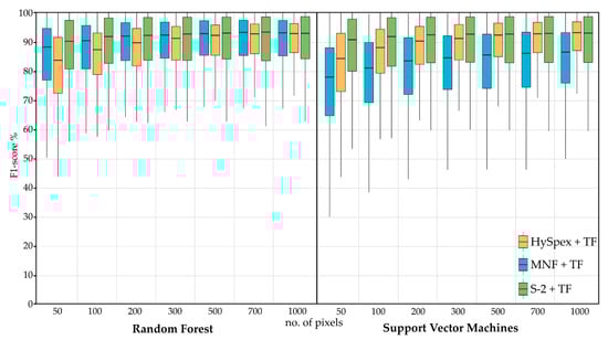 Reviewing the results achieved from all classification scenarios, (a) RF and SVM classifiers, (b) analyzed data (HySpex, MNF, and Sentinel-2), and (c) the number of used pixels for classification training (50, 100, 200, 300, 500, 700, and 1000), it can be seen that RF produced the best results and was the most stable classifier for all data sets (Figure 5); in each case, the lowest F1-scores for sets consisting of a minimum of 200 pixels exceeded 0.6, and for HySpex sets consisting of a minimum of 500 pixels, the F1-score values were higher than 0.7. The average F1-score values fluctuated around 0.9; the IQR values for individual sets were also similar (except for the classification sets consisting of 50–100 training pixels, which in each classification produced by far the lowest values). In the case of the SVM classifier, similar results were obtained only for the HySpex data set and slightly worse for the Sentinel-2 data, but the data after MNF compression provided the worst results as the lowest values fluctuated around 0.46. Repeating the classification process 100 times showed a relatively large discrepancy in the obtained results for sets consisting of 50 and 100 training pixels, which in practice means that there is a need to acquire more field-verified polygons, and if this is impossible, more attention should be paid to the obtained maps, e.g., by repeated field verification of the final results (Figure 5). In the case of a smaller number of training polygons for classification, better results were obtained for sets based on the MNF data and the Random Forest classifier, while when the set contained more than 300 pixels in the training patterns, the differences between the data sets and classifiers provided comparable results (Table 5).