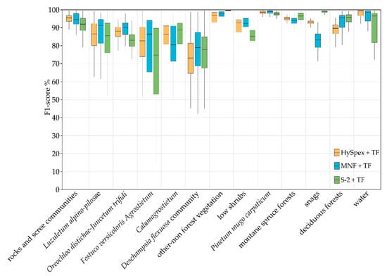 High-mountain grasslands and low shrubs are located in the subalpine and alpine belts. Hence, the use of the DTM significantly improves the classification results of HySpex images (8.4–28.5%). The same level of improvement is observed in the case of MNF bands, which are derivatives of the HySpex images. Luzuletum alpino-pilosae prefers humid habitats, which are more common on slopes with less sun exposure. Oreochloa disticha and Juncus trifidus are resistant to frost and wind that can dry out the habitat, also during snowless and cold winters, and during growing seasons, the plants use night dew, accumulated between dense growing leaves in clumps. The same can be observed in the case of forests and shrubs, which cover strictly defined belts. The topographic features are less useful in the case of the Sentinel-2 images because spectral data offer higher accuracies (Table 5), but an improvement by a few percentage points is still a support of the final maps (Table 6). The highest interquartile range (IQR) is found in non-forest vegetation communities (Figure 6). Festuco versicoloris Agrostietum is one of the most divergent classes, especially for the MNF and Sentinel-2 data, while Deschampsia flexuosa community and Calamagrostietum are also quite divergent, but the results are similar between the data sets. For the snags class, there is variation between the data sets. Across all data sets, one of the best classified communities is Pinetum mugo carpaticum and the montane spruce forest. Deciduous forests are also well classified. In the case of communities built of woody species, a smaller discrepancy is apparent.