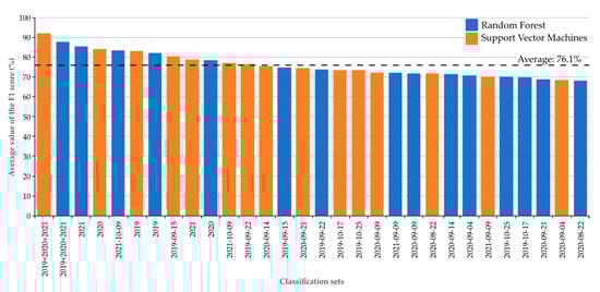 The best classification results (F1-score) achieved from classification sets and the Random Forest classifier.