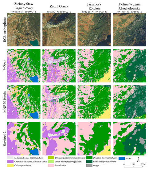 To sum up, the innovative element of the study is assessing the usefulness of multitemporal Sentinel-2 data compared to that of mono-temporal airborne HySpex images for monitoring dominant communities, including initial phases of cryptogamic plant communities through scree communities and shrubs and ending with deciduous and coniferous forests, which are partly attacked by bark beetles. An important issue is assessing hyperspectral data compression algorithms, because 16-bit HySpex images with a spatial resolution of 2 m recorded in 430 spectral bands significantly burden classification processes; a similar problem appears using multitemporal Sentinel-2 images. This is why it is so important to choose the right data set and methods that will enable highly accurate plant community classification and ensure continuous monitoring of these areas, especially when these are protected areas and difficult to access for field research.