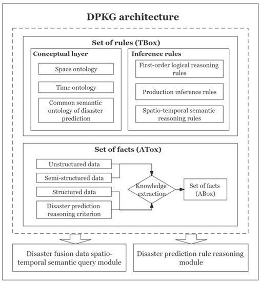 The DPKG for disaster prediction consists of two parts, namely the rule set (TBox) and the fact set (ABox). The TBox consists of the conceptual layer and the inference rules. The conceptual layer is the common semantic basis for describing the hierarchical relationship of various factors in disaster prediction scenarios. The inference rules are the common logic basis for multi-source spatio-temporal data that supports semantic reasoning. The ABox constitutes the instance layer of the knowledge graph, which contains the time, space, status, and other attribute information of various types of ground objects related to disaster emergency extracted from multi-source heterogeneous data. The ABox and the TBox constitute the reasoning basis of the DPKG. Through the rapid retrieval of spatio-temporal data in disaster areas, multi-source spatio-temporal data analysis can be realized. The architecture diagram will be described in detail later.