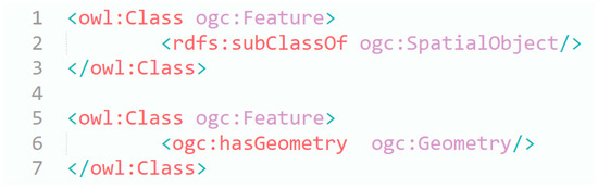The expression of spatial ontology applies A Geographic Query Language for RDF Data (GeoSPARQL) [17] that is a geographic semantic query specification proposed by OGC (Open Geospatial Consortium) [18]. The geographic semantic query mainly includes the following three common contents.