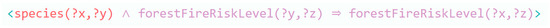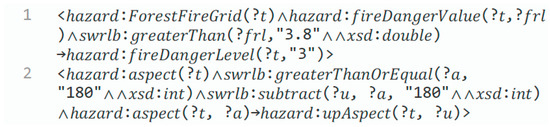 Due to the limitation of the knowledge representation of first-order logic, this paper applies SWRL (Semantic Web Rule Language). It extends the set of OWL axioms to include Horn-like rules. In this study, SWRL is used to further enhance the expression of rules for DPKG. A rule has the form, where both antecedent and subsequent are conjunctions of atoms written. Using this syntax, a rule asserting that the combination of the tree species’ properties and the tree species’ forest fire risk-level properties implies the tree’s forest fire risk-level properties, as shown in Figure 7.