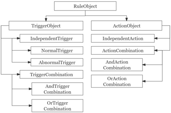 The event (or action) object concept is further subdivided into independent events (or actions) and event (or action) combinations, which together form the concept of knowledge inference rules. The logical structure is shown in Figure 8.