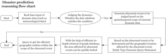 When a specific attribute of the external dynamic data satisfies the numerical conditions defined by the rule, it is regarded as an abnormal event candidate. Its time range and space range are treated as the basic condition of semantic query. It queries with SPARQL Protocol and RDF Query Language (SPARQL) [21] statements for a geographic entity that has an intersection with the abnormal event candidate and satisfies the reasoning conditions. When querying the spatio-temporal relationship in the graph database, it can quickly locate the affected area of the abnormal event candidate because the graph database is good at efficient depth-first query, as shown in Figure 9. It plays an important role in the emergency field with high response speed requirements.