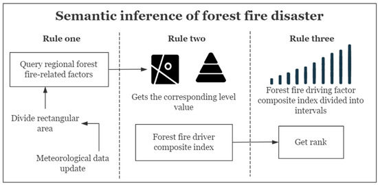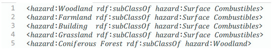 As defined in the Common Semantic Ontology of Disaster Prediction, surface combustibles include Woodland, Farmland, Building, and Grassland, and Coniferous Forest belongs to Woodland. Based on first-order logical reasoning, it concludes that Coniferous Forest belongs to Surface Combustibles. With the prefix of hazard, the above process can be formally defined as shown in Figure 11. Based on these expressions, can be inferred.