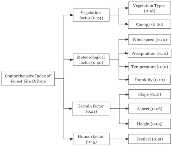 Forest fire risk prediction needs the theoretical support because the above spatio-temporal data is only a prerequisite for forest fire risk prediction. In this case, the AHP (Analytic Hierarchy Process) is used to evaluate forest fire risk indicators. This paper builds an indicator system for four types of forest fire risk factors: meteorology, terrain, vegetation, and man-made. The weights are shown in Figure 15.