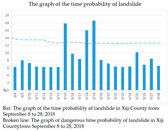 The graph of the time probability of landslide. The bar is the graph of the time probability of landslide in Xiji County from 8–28 September 2018. The broken line is the graph of dangerous time probability of landslide in Xiji County from 8–28 September 2018.