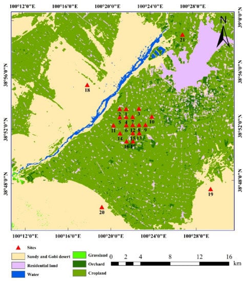 Zhangye oasis is located in the middle reach of Heihe River basin in the arid and semiarid regions of the northwest of China (100°10′E–100°32′E, 38°44′N–39°00′N; Figure 1), the terrain is relatively flat at about 1550 m above mean sea level. The climate in this region is characterized by cold and dry, with an average annual air temperature of 7.3 °C and precipitation of 130.4 mm (from 1971 to 2010), diurnal temperature difference can reach 15–20 K or more. Cropland, orchard, sandy and Gobi Desert, urban/villages, grassland, and wetland are the main landscapes over Zhangye oasis (Figure 1).