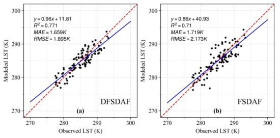 Validation of night ASTER-like LST by (a) DFSDAF and (b) FSDAF. The red dashed lines are the 1:1 lines, and the blue solid lines represent the best fit linear relationship. R2 is the determination coefficient, MAE is the mean absolute error, and RMSE is the root mean square error.