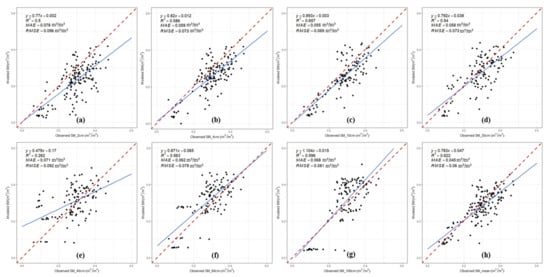 Comparisons of SM estimates from the TNSTI model over the vegetated areas with in situ observations at different depth: (a) 2 cm, (b) 4cm, (c) 10 cm, (d) 20 cm, (e) 40 cm, (f) 60 cm, and (g) 100 cm; (h) mean of SMs at all depths. The red dashed lines are the 1:1 lines, and the blue solid lines represent the best fit linear relationship. R2 is the determination coefficient, MAE is the mean absolute error, and RMSE is the root mean square error.