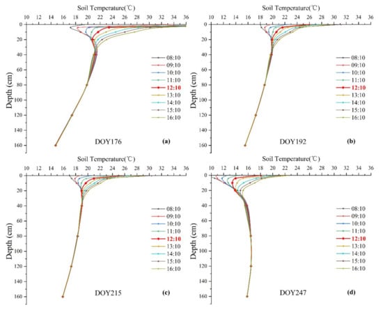 Soil-temperature profiles at Daman superstation (S15) from 8:10 a.m. to 4:10 p.m. on DOY 176, 192, 215, and 247 in 2012. (a) DOY 176 in June, (b) DOY 192 in July, (c) DOY 215 in August, and (d) DOY 247 in September. The bold red line represents the local overpass time for ASTER.
